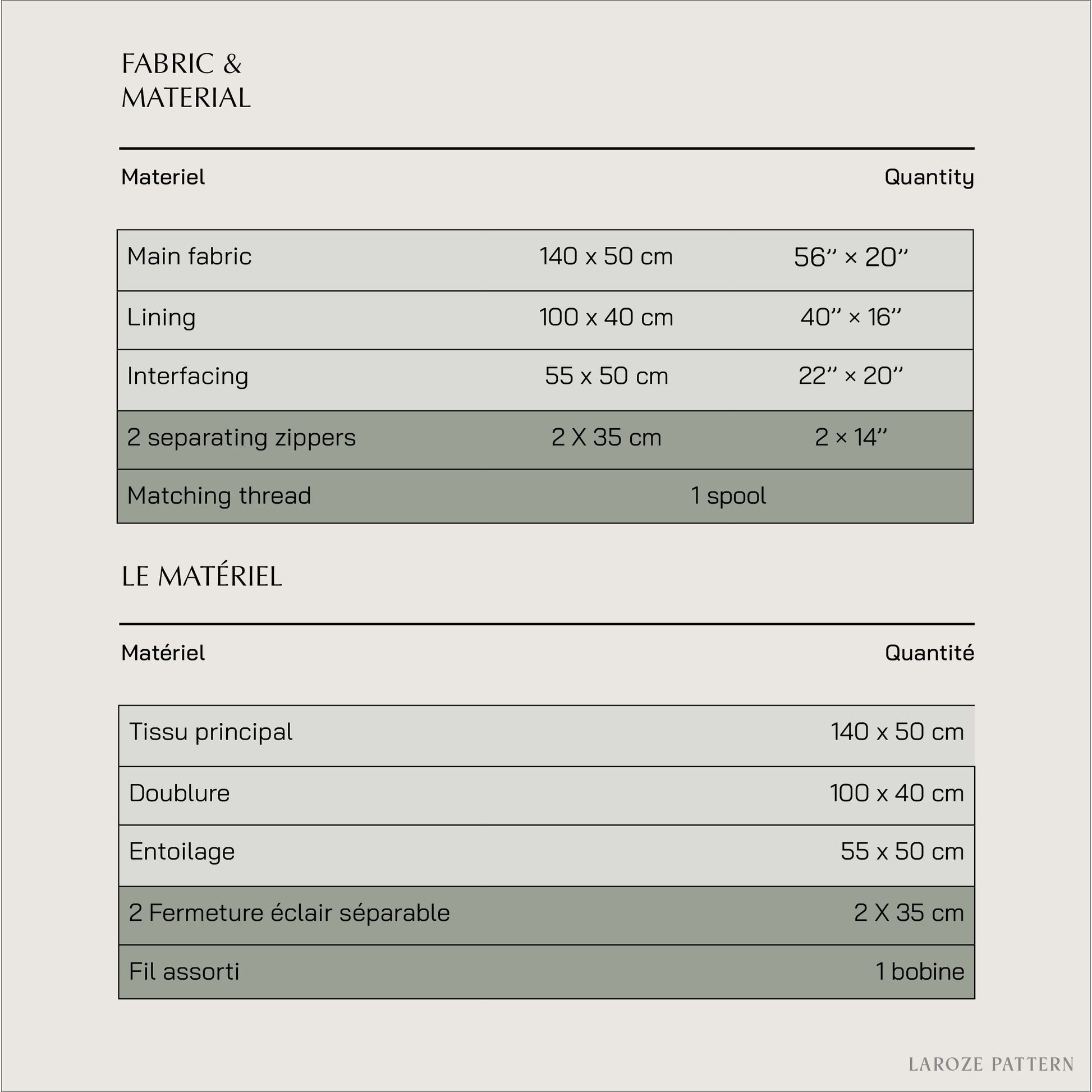 Référez-vous au panneau de tissu pour les quantités.